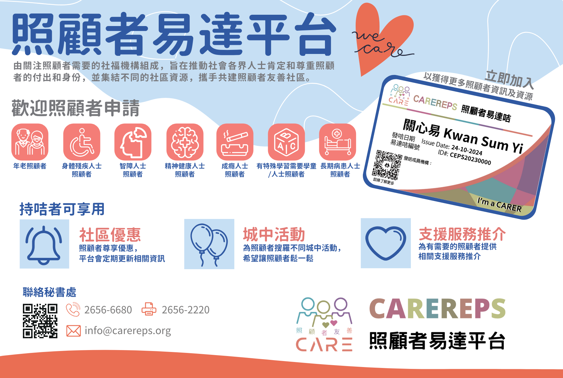 「照顧者易達咭」 (Carer EPS)集結不同社區資源,與社區上各個持份者共建照顧者友善社區。期望以易達咭來肯定照顧者的付出,讓照顧者感到被關注。 「照顧者易達咭」為照顧者提供四大功能: 1. 推動社會肯定照顧者的身份和付出 2. 提供以照顧者為本的資訊、社區優惠和服務 3. 以便捷方法獲取相關資訊 4. 介紹為照顧者而設的最新服務